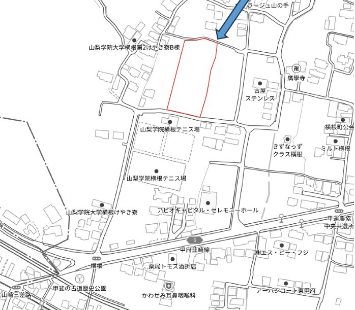 山梨学院横根テニス場の北、主要幹線道路までのアクセス良い閑静な住宅地。